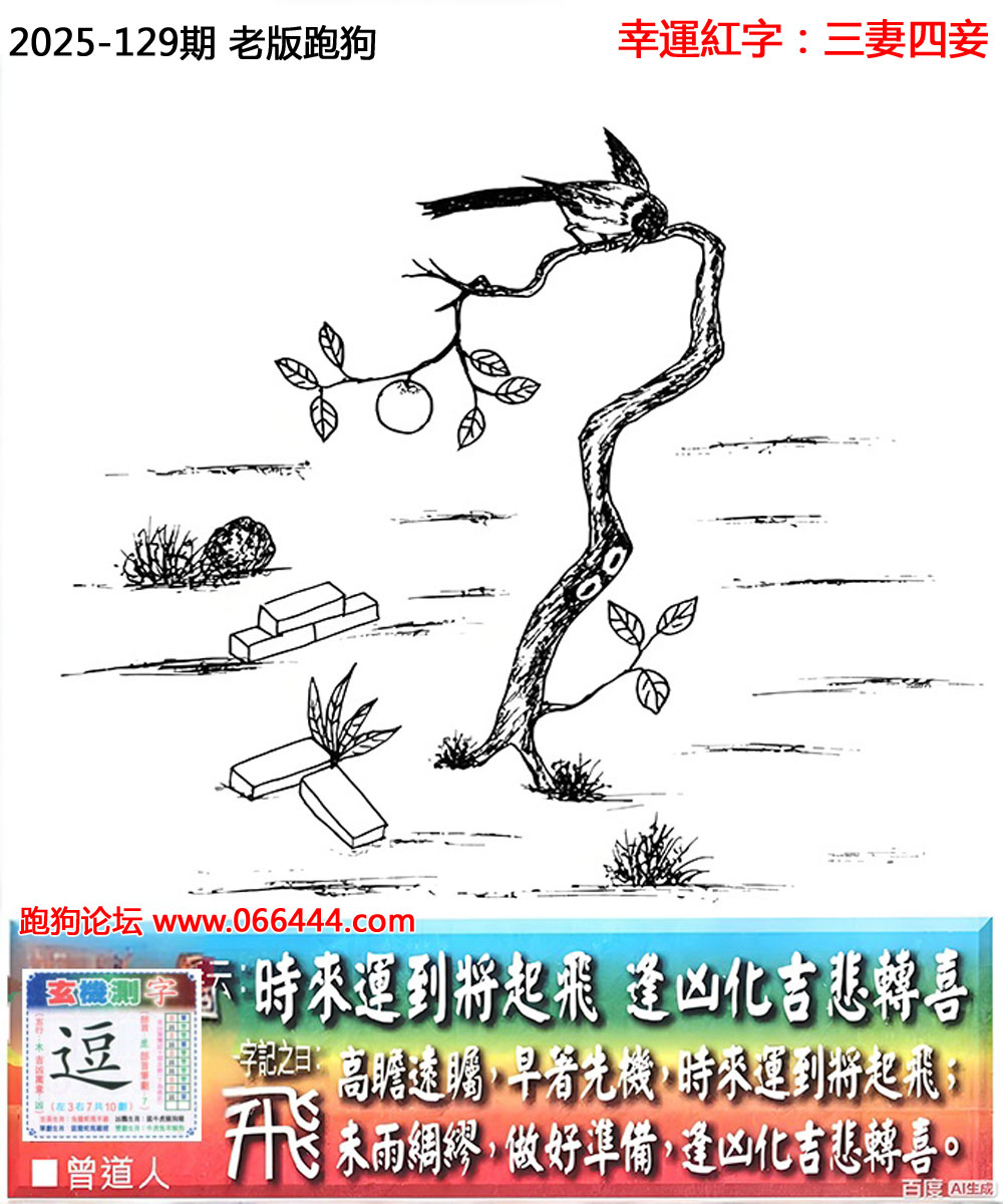 129期老版跑狗一字記之曰:【飛】 詩雲:時來運到將起飛,逢凶化吉悲轉喜。 高瞻遠矚,早著先機,時來運到將起飛; 未雨綢繆,做好準備,逢凶化吉悲轉喜。 玄機測字:《逗》
